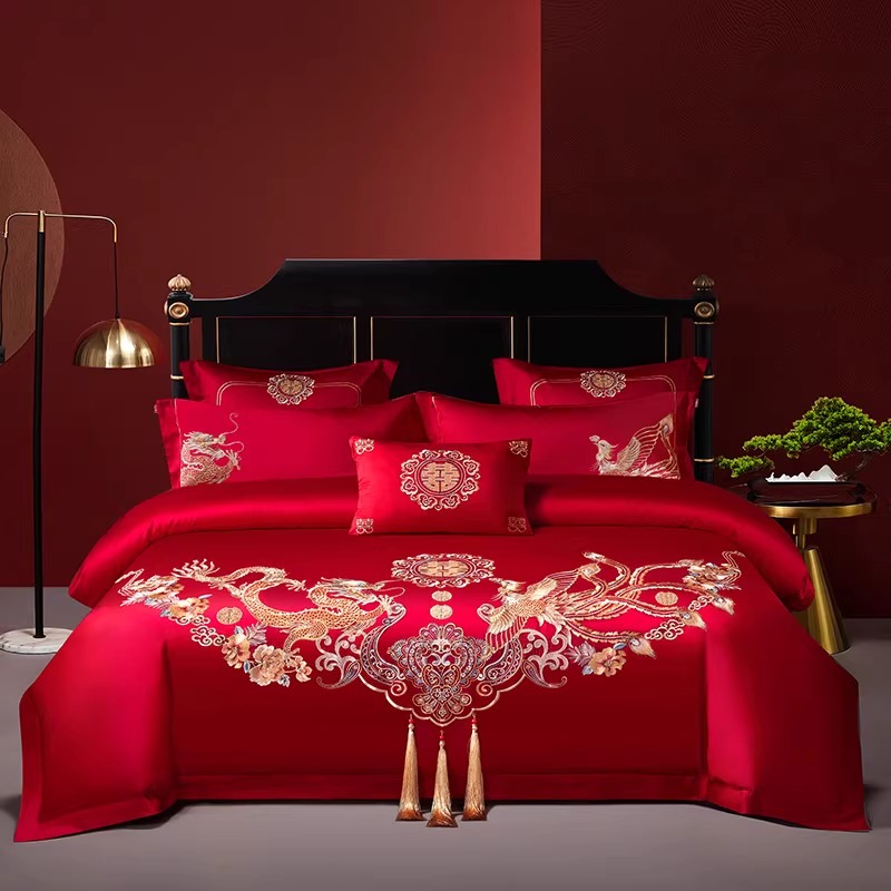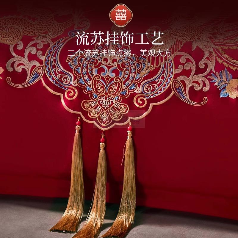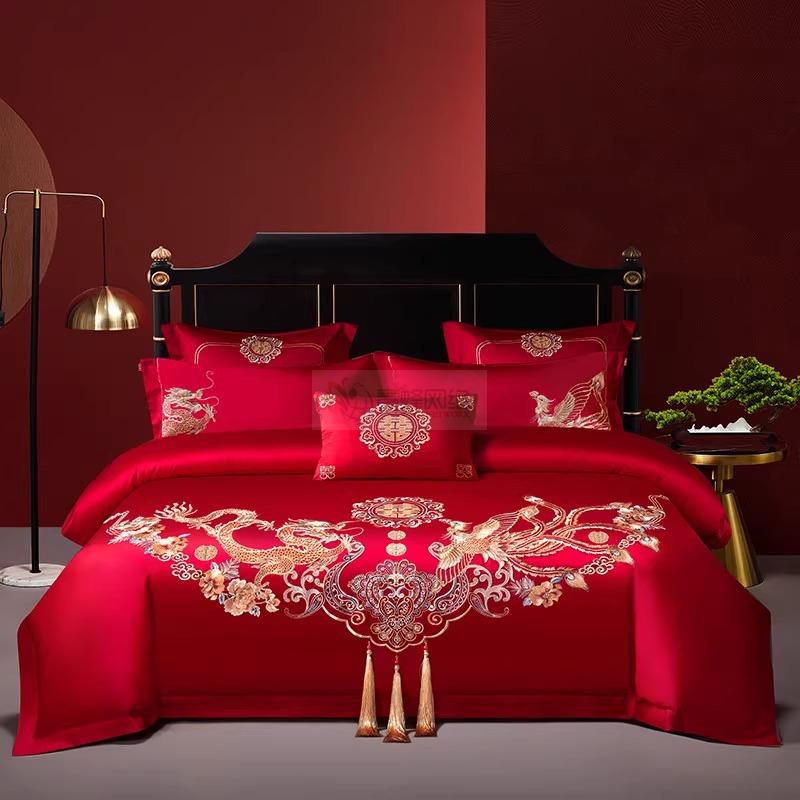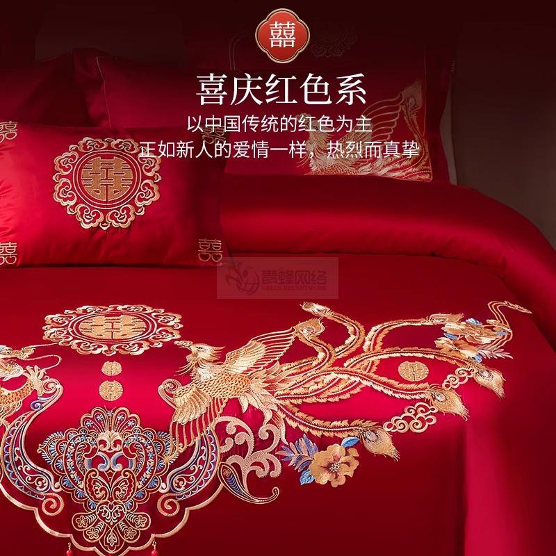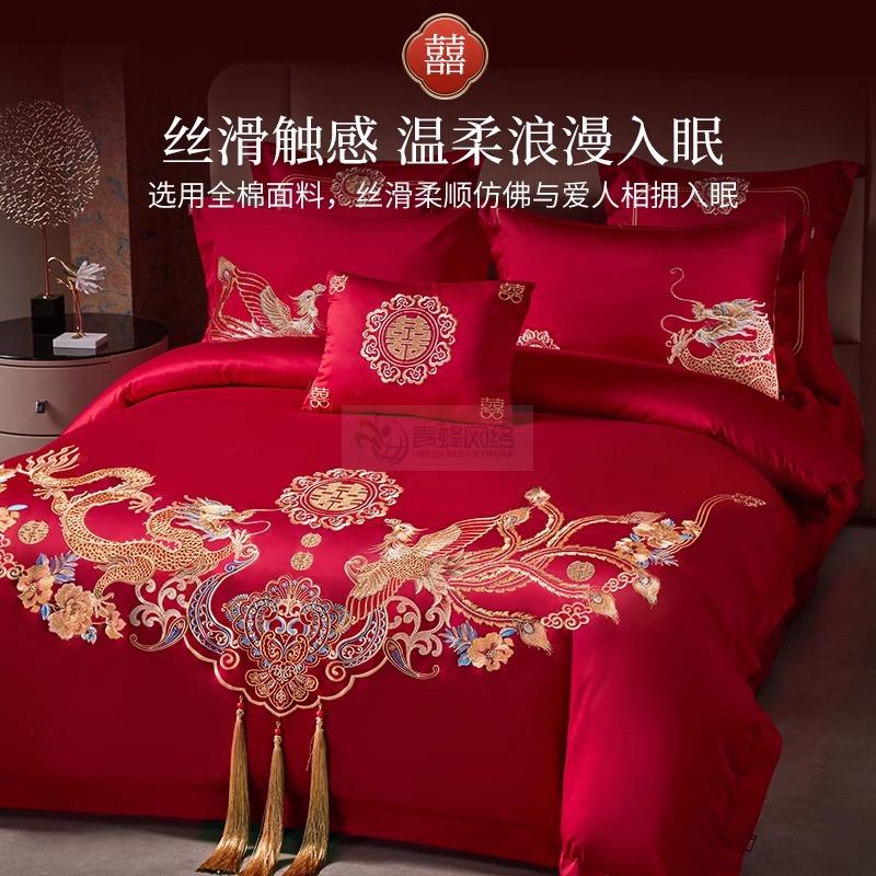 艾维婚嫁结婚四件套纯棉全棉龙凤喜被刺绣红色新婚喜庆床上用品